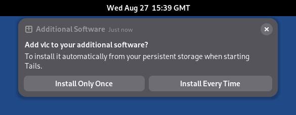 aptcommand.После установки пакета появляется уведомление с вопросом, хотите ли вы устанавливать этот пакет каждый раз при запуске Tails в будущем.